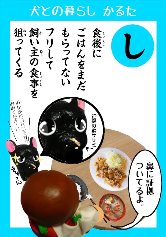 「ぼく まだごはんもらってません」顔で食卓の肉をねだってくる。