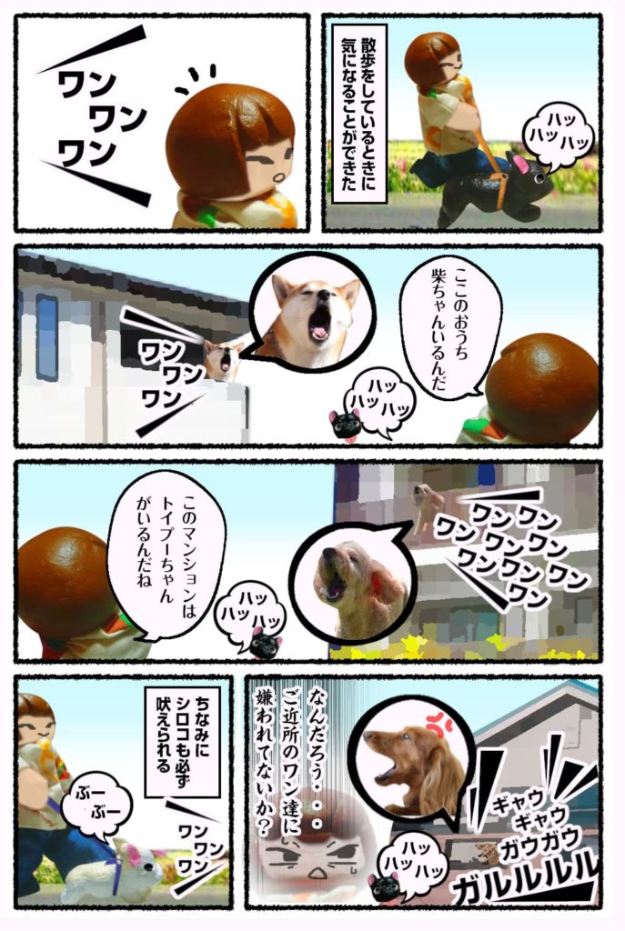 中には火がついたような勢いで吠えちゃう子がいて、そこの飼い主さんが「こんなに激しく吠えるの初めて見た」くらいにびっくりしてるときもあった。なんだか申し訳なくて足早に去ったけれど・・・